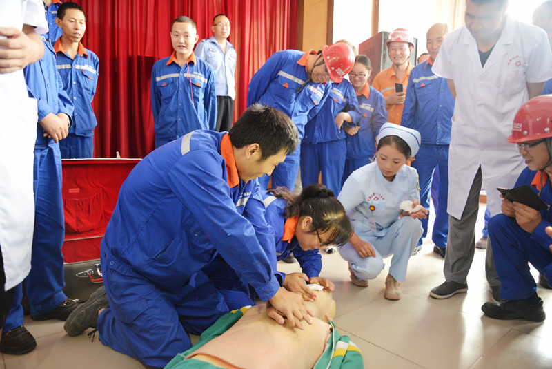 為全面提升突發(fā)事件衛(wèi)生應(yīng)急處置能力,8月14日,隴南公司邀請武都區(qū)第一人民醫(yī)院急救中心醫(yī)護人員開展了應(yīng)急醫(yī)療救援演練,就搶險救援和處置突發(fā)事件時出現(xiàn)的骨折、出血、昏迷、休克等情況如何處置進行培訓(xùn)講解。圖為醫(yī)務(wù)人員為職工講解如何運用心肺復(fù)蘇術(shù)開展緊急施救的情景。(孫光亮/報道)